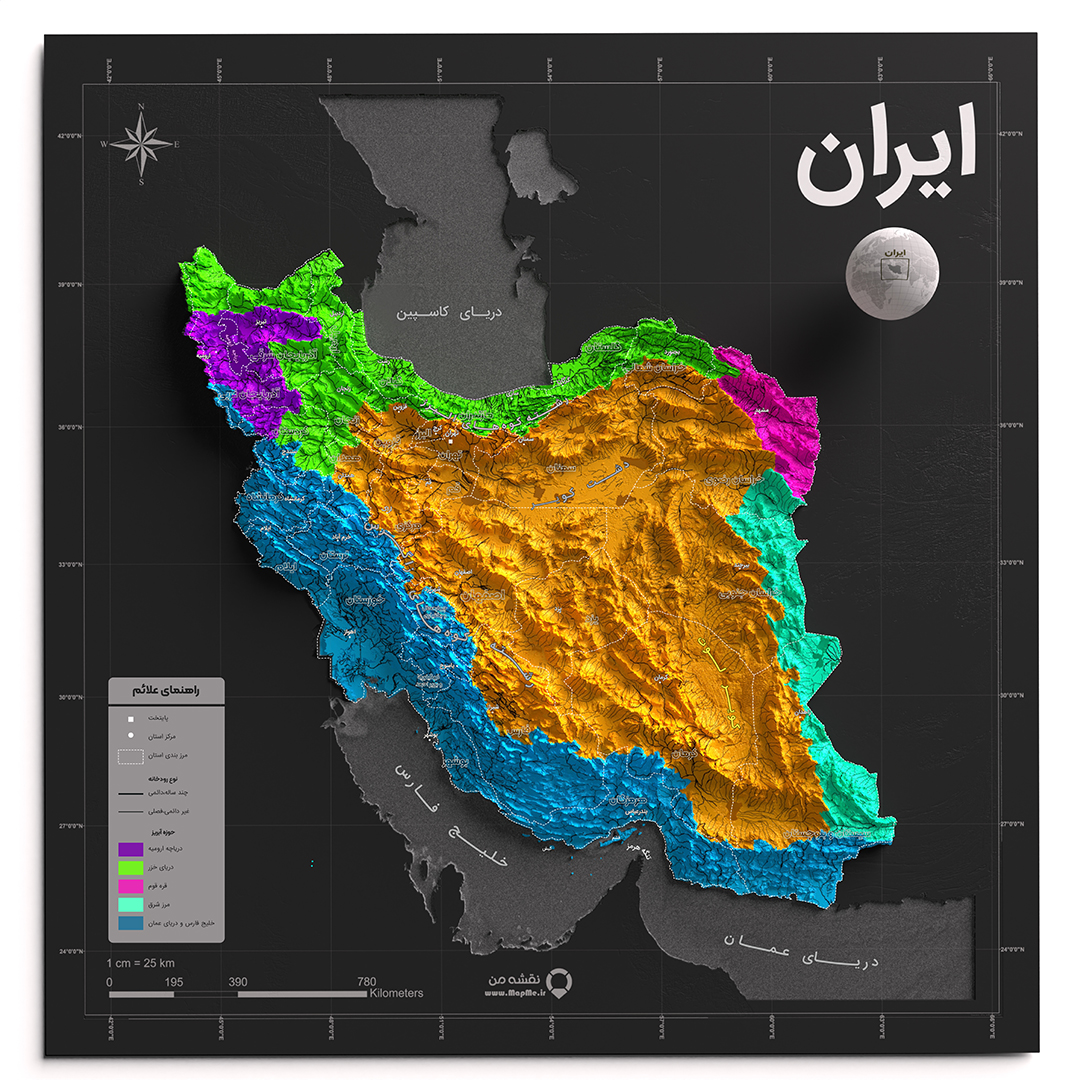 نقشه سه بعدی توپوگرافی ایران به همراه حوزه های آبریز با کیفیت بالا در ابعاد بزرگ در قالب عکس